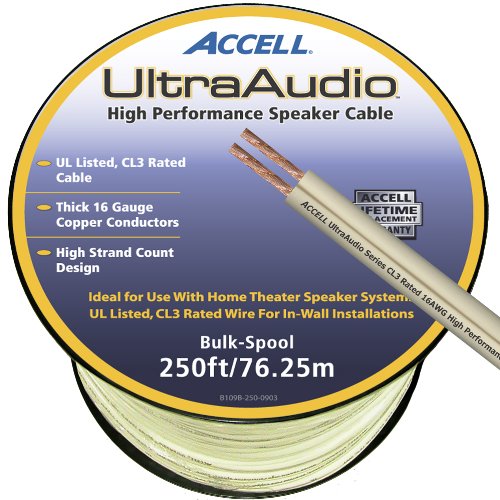 Accell UltraAudio Class 3 (CL3) rated, UL Listed speaker cable is designed to provide outstanding audio clairity to your stereo or home theater system. The cables soft and flexible jacket provides easy routing while its white colored jacket blends in nicely with light colored walls. The UL Listed, CL3 rated jacket is ideal for in-wall installation. This UltraAudio speaker cable is available in 16-gauge conductor size and two spool lengths. Accell cables are designed to eliminate signal degradation and noise that can diminish the quality of your sound. Our 99.99% pure copper speaker cable resists the corrosion found on ordinary speaker cables and delivers improved dynamics and unrestricted high frequency response. The soft UltraFlex jacket makes cable routing through framing and drywall easy. It is durable, providing excellent cable protection even under extreme conditions. Accell UltraAudio high-resolution speaker cables offer superb performance and reliability. Featuring high-quality materials and a CL3 Rated, UL Listed jacket, this Accell UltraAudio cable will provide low signal loss for extremely accurate sound reproduction.